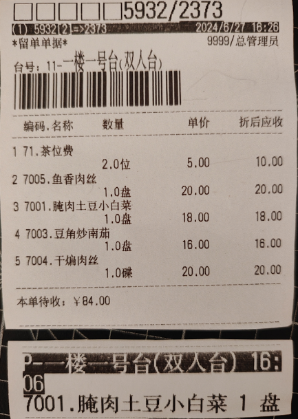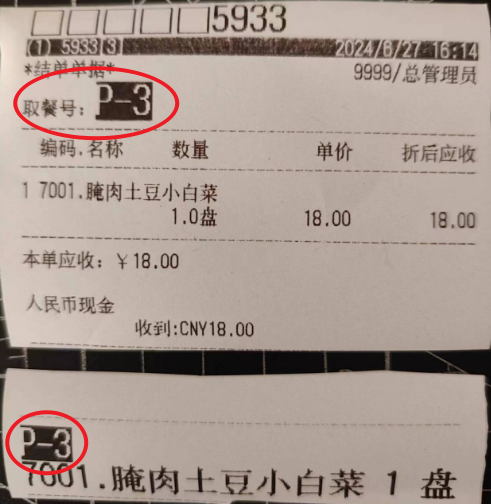 1、对于销售快餐类产品,和销售普通产品无任何不同,收款软件如果发现单据中有需要打印厨房小票的产品,就会在前台小票上打印取餐号(见图二),再凭厨房小票对应到顾客。