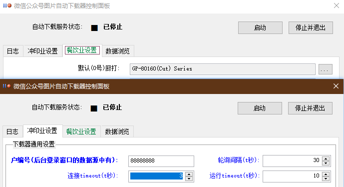 “对应输出的后厨打印机编号”... 当贵店有两个或更多个厨房时,可以使用该项指定使用某个后厨打印机输出厨房小票(见“自动下载器软件的设置方法”)。