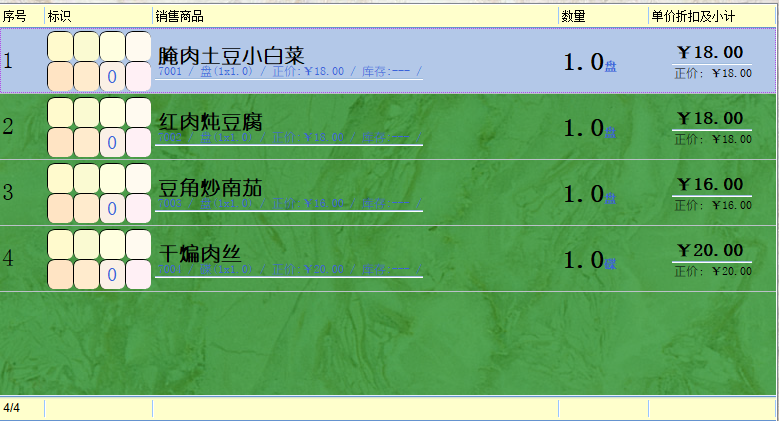 开台成功后会自动退回到产品销售的主界面,在右边的状态栏中会显示当前单据所占用的台房信息(图六)。现在只需要在该界面下输入顾客点的菜品即可。在输入完毕后请按【留单】键保存(是否打印小票可以按实际情况决定)。注:新输入的菜品只有在留单后才会输出到厨房小票打印机上。