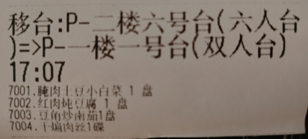 3、移台:本软件允许进行移台操作。“75”+【帮助】后选择要移走的台房号,按下“移台房”按钮再输入要移动到的台房号即可。同时,会在相应厨房打印机上输出新的移台小票,对于在原台房出过的菜品会在移台小票中显示(见图八)。